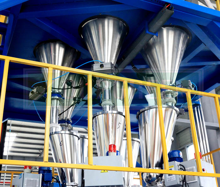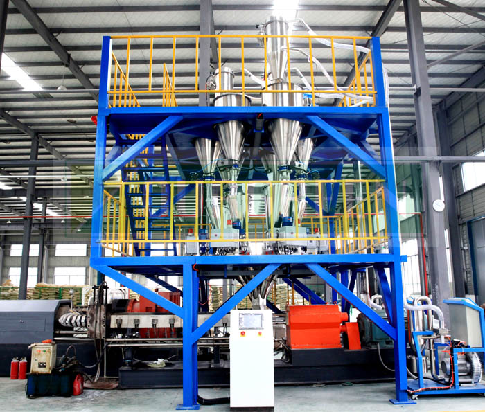 公司的自動上料系統(tǒng)采用特制的攪拌上料系統(tǒng),以確保各種原料混合的均勻。自動化控制保證系統(tǒng)運行穩(wěn)定,按照生產配方將各組分別加入到料倉中,經(jīng)真空上料機后充分攪拌,后將攪拌均勻的物料加入到擠出機的料斗中。該產品由公司優(yōu)化設計,使其能夠適應各種型號的擠出機組。